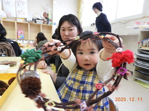 親子でクリスマスリースづくり。リースは子ども達が育てたサツマイモのツルを丸めて作りました。