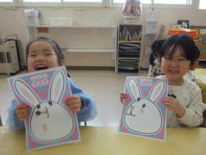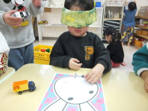 目隠しをしてお顔のシールを貼ります🐰