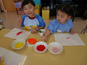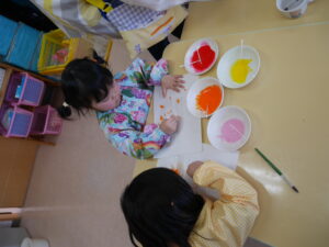 りすさんは、好きな色の絵の具と綿棒を使ってだるまの製作をしました!