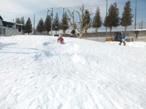 くま組さんのお外遊びではそりや米パンツでお尻すべり!