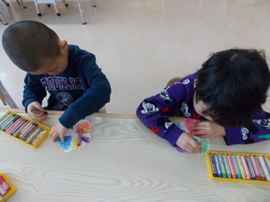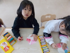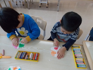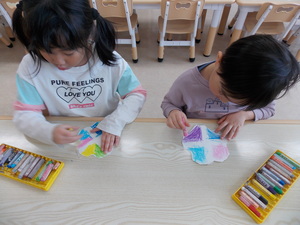 2/16(月)はひな祭りの製作の一部を作りました!お花の形を線に沿って上手に切りましたよ✨