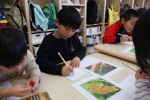 写真を見ながら真剣な顔つきでトノサマバッタを描いてます✨
