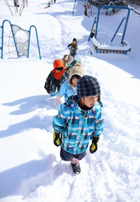 先生の後ろを付いてくるので大きな足跡に足が取られないように慎重に歩く子ども達( *´艸`)大きな足でごめんね💦
