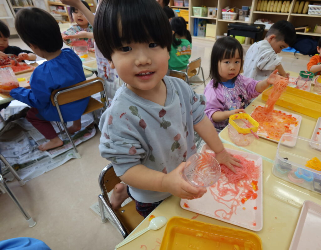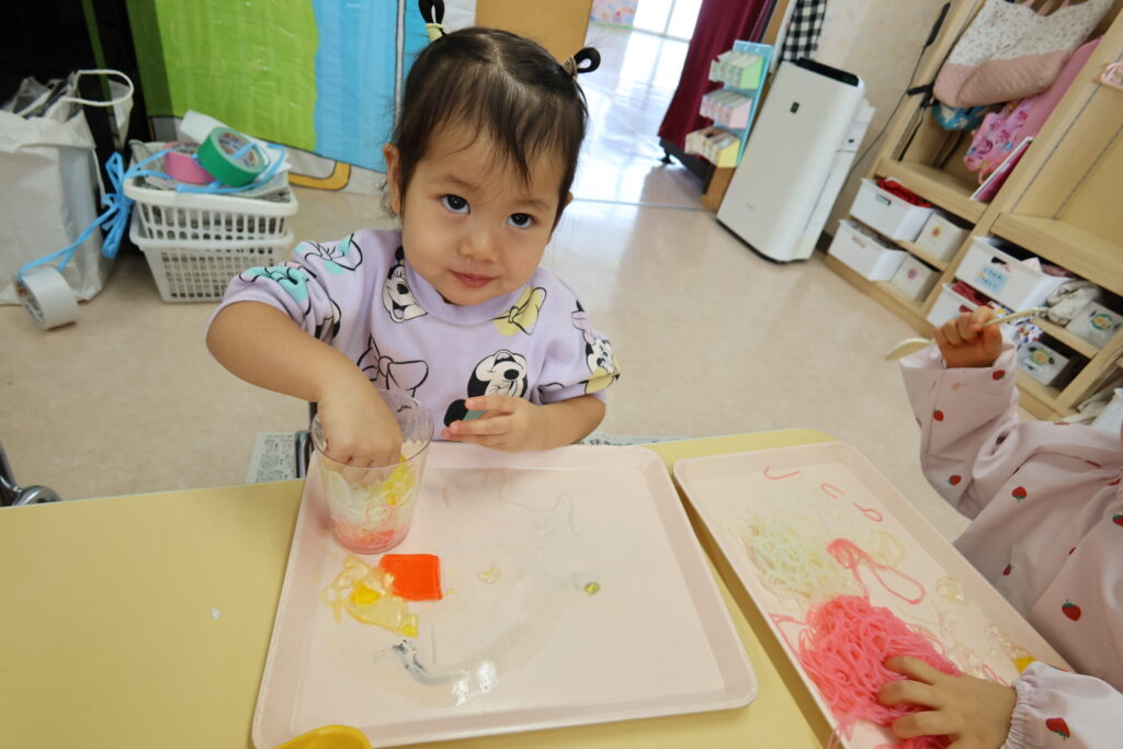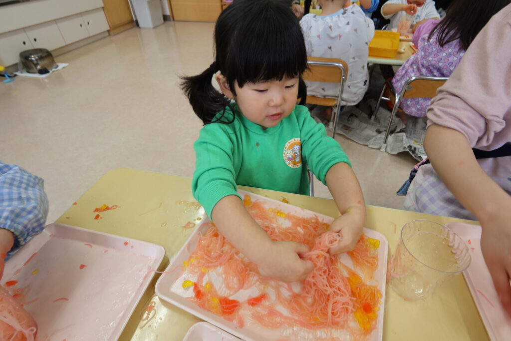 春雨、寒天遊びをりす組さんと楽しみました。