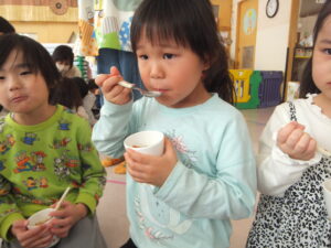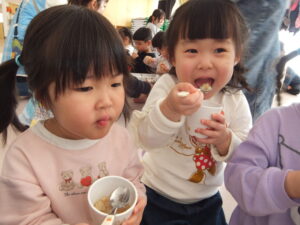 保育園にある避難食「クリームシチュー」を試食しました。