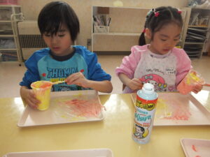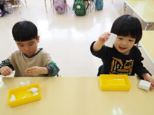 シェービングフォームで感触遊びも楽しみました☺