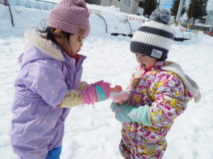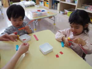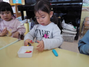 りす組さんは新しくハサミと粘土を始めました。